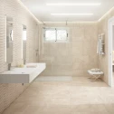 Красивая коллекция для ванной комнаты. Текстурированная плитка в зоне мойки, выделение другим цветом зоны приема душа. Приятная цветовая гамма и красивый рисунок на полу