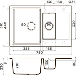 Тип: Кухонная мойка x Вид установки: В один уровень со столешницей x Вид установки: Встраиваемая сверху x