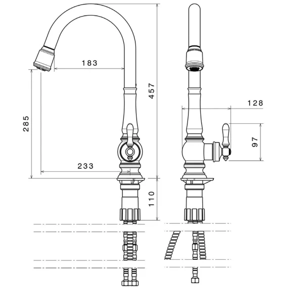 Крепление, Аэратор, Гибкая подводка, Душевой шланг, Душевая лейка