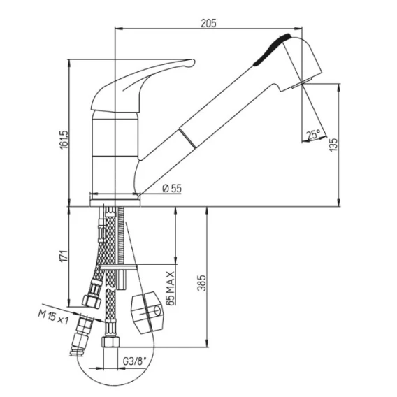 Крепление, Аэратор, Гибкая подводка, Душевой шланг, Душевая лейка