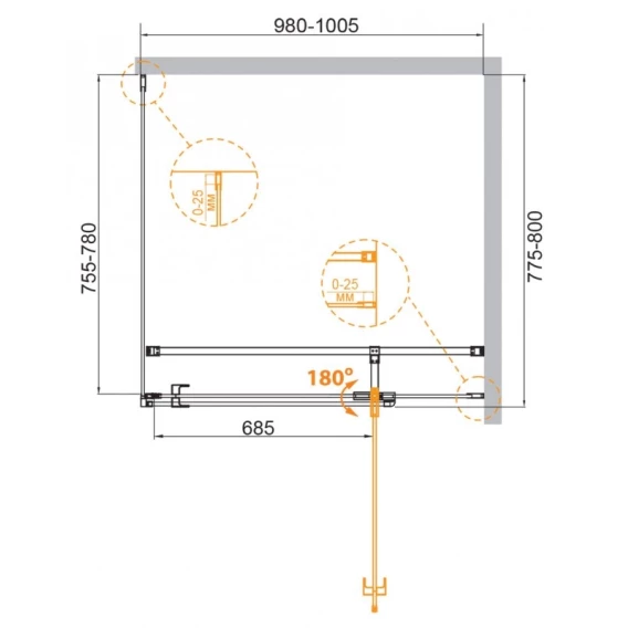Габариты с диапазоном регулировок, мм: (980-1005)x(780-805)x1950