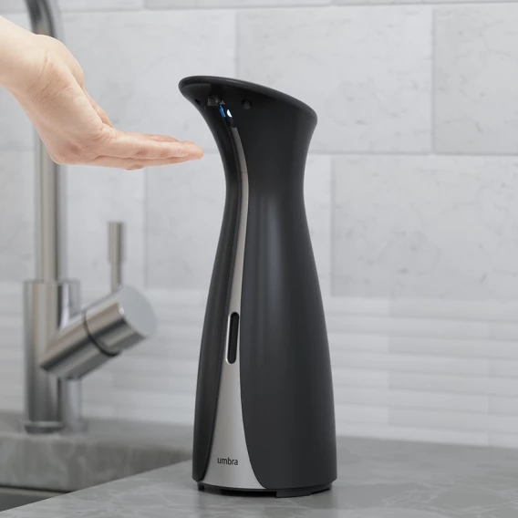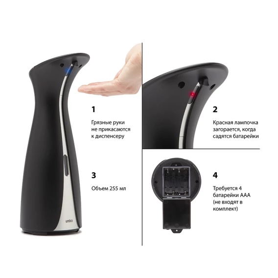 Чтобы помыть грязные руки, нужно касаться ими чистого диспенсера, а это порой так неприятно. Сенсорный диспенсер Otto избавит от этой проблемы: достаточно поднести к нему руки и вы получите порцию жидкого мыла. Этот удобный предмет позволит сохранить чистоту и порядок на кухне или в ванной комнате.Идея: можно использовать его на кухне для моющего средства.Диспенсер вмещает 255 мл жидкого мыла. Для работы требуются 4 батарейки АAA (не входят в комплект).