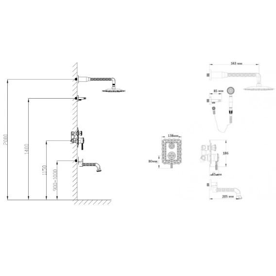 Аэратор, Душевой шланг, Душевая лейка, Подключение для душевого шланга с держателем, Верхний душ, Излив, Скрытая монтажная часть, Смеситель, Кронштейн