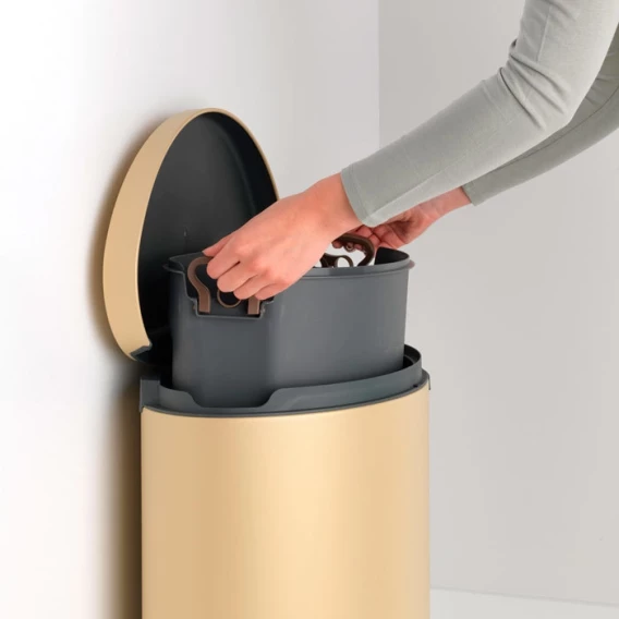 Экономия места – бак удобно устанавливается вплотную к стене или кухонному шкафу.Бесшумное закрывание и мягкий ход педали.При открывании крышка не касается стены.При открывании вручную крышка фиксируется в открытом положении.Удобная очистка – съемное внутреннее ведро из пластика со складными захватами.Удобная смена мешков для мусора – фиксация внутреннего ведра в «поднятом» положении.Бак удобно перемещать – гибкая ручка для переноски.Предохранение пола от повреждений – пластиковое защитное основание.Всегда опрятный вид – в комплекте идеально подходящие по размеру мешки для мусора PerfectFit (размер L).