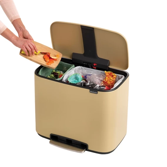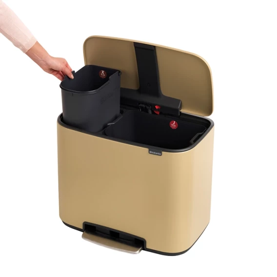 Бесшумный – плавное закрывание крышки и необыкновенно мягкий ход педали.Не пропускает запах – плотно прилегающая крышка.Экономия места – удобно устанавливается вплотную к стене или в углу.Крышка удобно фиксируется в открытом положении специальным переключателем.2 съемных внутренних ведра – идеальное решение для раздельного сбора домашних отходов.Удобная очистка – съемное внутреннее ведро из пластика.Отличная устойчивость и защита пола от повреждения – нескользящее основание.Бесплатные упаковки мешков для мусора Brabantia PerfectFit (размеры X и J) – удобная замена и всегда опрятный вид.Бронзовый сертификат "Cradle to Cradle".Бак подлежит вторичной переработке на 98 %, упаковка и внутренние ведра на 100%.