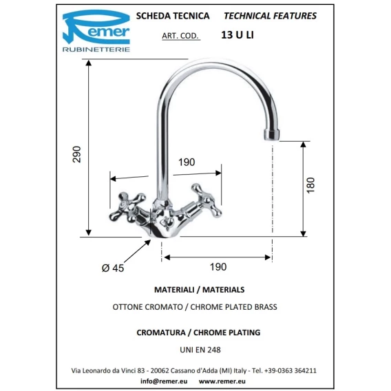 Смеситель для раковины с донным клапаном Remer Liberty 13ULI