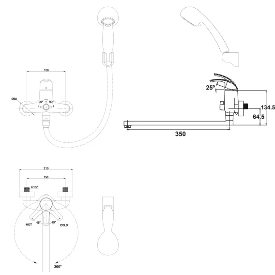 Аэратор, Металлическая розетка, Эксцентрики, Душевой шланг, Душевая лейка, Держатель для душевой лейки