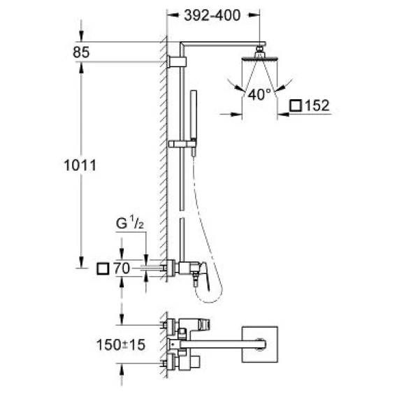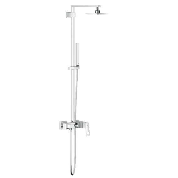 Eurocube System 150Душевая система с однорычажным смесителем настенного монтажавключает в себя:душевой кронштейнвынос 400 ммоднорычажный смеситель для душа с переключателемвыбор между:Верхний душ Euphoria Cube 152 мм x 152 ммдушевая струя Rainс шаровым шарниромугол поворота ± 20°ручной душ Euphoria Cube Stick (27 698 000)GROHE EcoJoy® Технология совершенного потока при уменьшенном расходе водырегулируется по высоте с помощью скользящего элементадушевой шланг 1750 мм (28 388 000)минимальный расход воды 7л/минGROHE DreamSpray® превосходный поток водыGROHE StarLight® хромированная поверхностьGROHE SilkMove®с системой SpeedClean против известковых отложенийсовместим с проточным водонагревателем от 18 kВ/чминимальное давление 1,0 бар