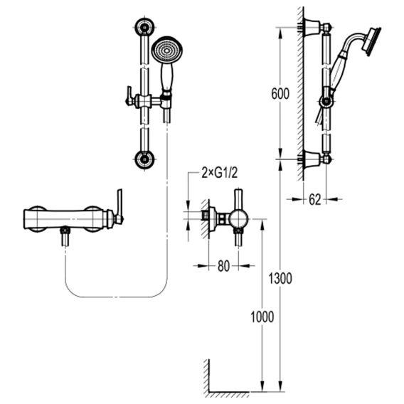 Металлическая розетка, Эксцентрики, Душевой шланг, Душевая лейка, Держатель для душевой лейки, Штанга душевая