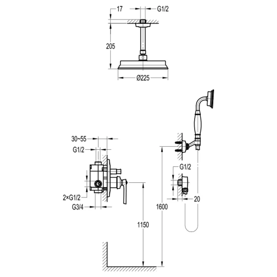 Душевая лейка, Держатель для душевой лейки, Подключение для душевого шланга, Верхний душ, Скрытая монтажная часть, Смеситель, Кронштейн