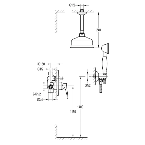 Душевая лейка, Подключение для душевого шланга с держателем, Верхний душ, Скрытая монтажная часть, Смеситель, Кронштейн