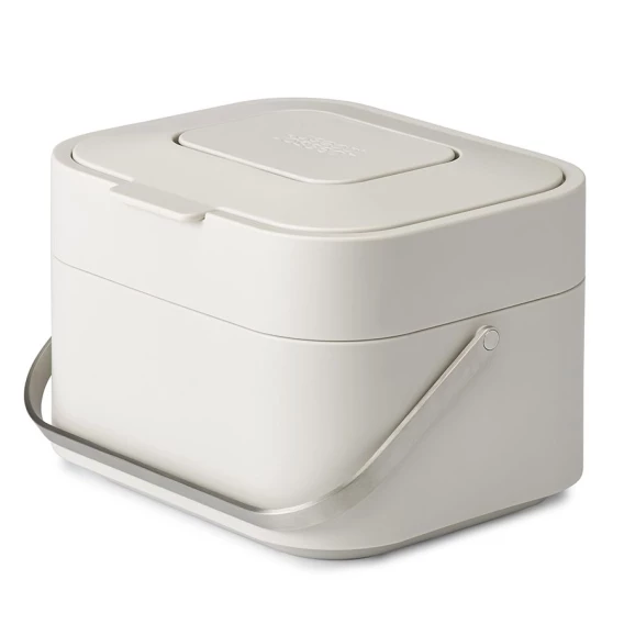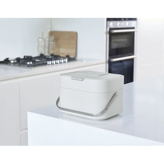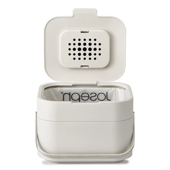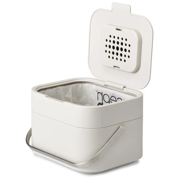 Контейнер, разработанный с целью минимизировать возникновение неприятных запахов от пищевых отходов. Инновационная вентилируемая конструкция позволяет воздуху циркулировать внутри емкости, что способствует уменьшению влажности. Освежающий фильтр впитывает неприятные запахи. Крышка плотно закрывается, не выпуская запахи наружу. Ручка из нержавеющей стали обеспечивает удобство при переноске. Таким образом, во время приготовления пищи контейнер можно установить на рабочий стол, а затем убрать в укромное место. Корпус из полипропилена очень легко очищается. Специальные отверстия и съемный ободок по краям контейнера аккуратно удерживают мусорный мешок.