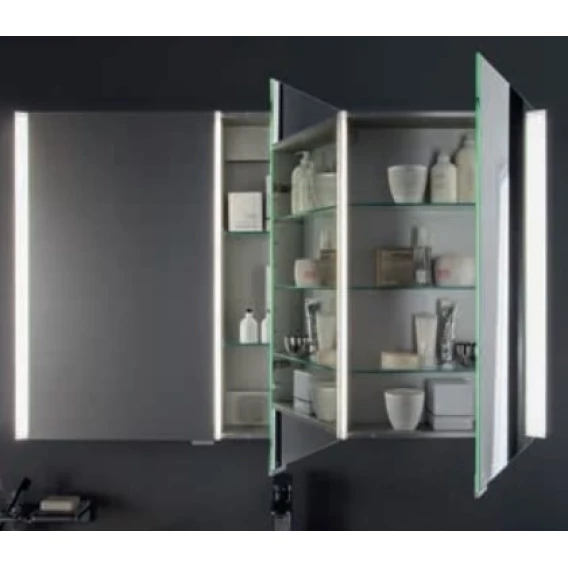 Зеркальный шкафчик, 1300 мм, алюминий; 3 двери с двухсторонней зеркальной поверхностью; сенсорный выключатель, 2 разъема, 4 вертикальных подсветки LED с регулируемой яркостью, внешняя подсветка снизу.