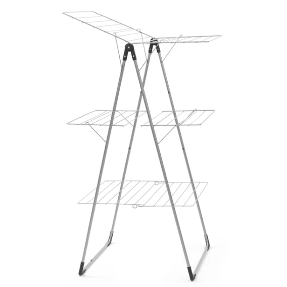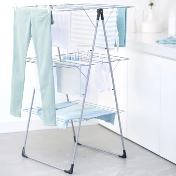Трехъярусная сушилка с длиной сушки 23 метра обеспечивает достаточно места  для сушки полной машинной партии белья на площади всего в один квадратный метр. Ее конструкция позволяет вешать и длинные изделия, например, брюки. Просто раскладываем, регулируем «крылья» и удивляемся тому, как это здорово и практично! Кроме того, сушилка имеет специальные полочки для сушки деликатных изделий в расправленном виде.
