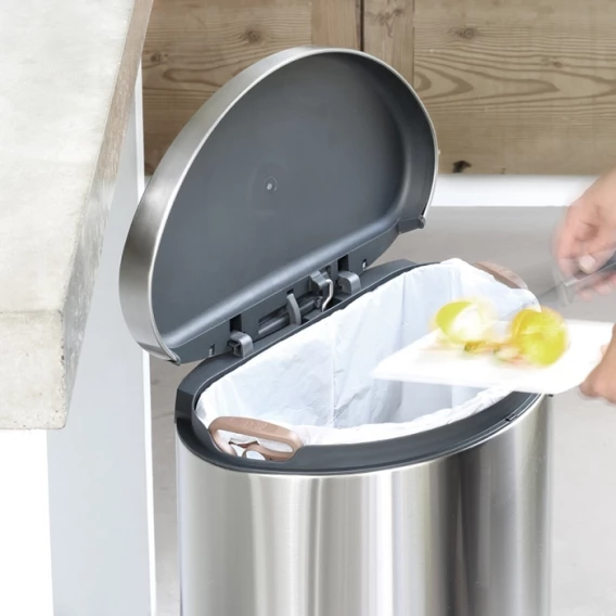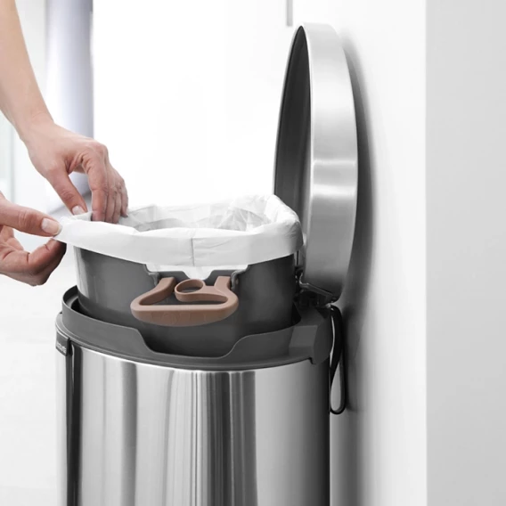 Экономия места – бак удобно устанавливается вплотную к стене или кухонному шкафу.Бесшумное закрывание и мягкий ход педали.При открывании крышка не касается стены.При открывании вручную крышка фиксируется в открытом положении.Удобная очистка – съемное внутреннее ведро из пластика со складными захватами.Удобная смена мешков для мусора – фиксации внутреннего ведра в «поднятом» положении.Бак удобно перемещать – гибкая ручка для переноски.Предохранение пола от повреждений – пластиковое защитное основание.Покрытие с защитой от отпечатков пальцев (FPP).Всегда опрятный вид – в комплекте идеально подходящие по размеру мешки для мусора PerfectFit (размер L).