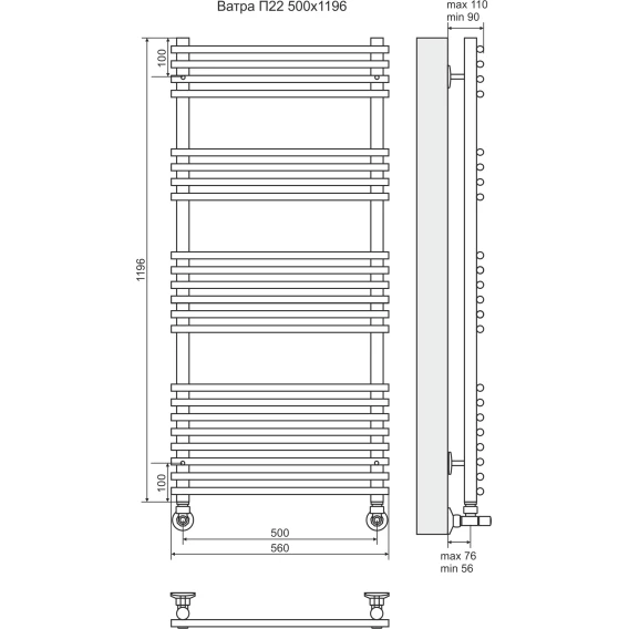 Полотенцесушитель водяной 1196x560 мм подключение нижнее Terminus Ватра П22
