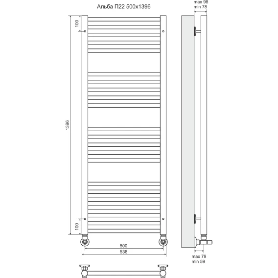 Полотенцесушитель водяной 1396x538 мм подключение нижнее Terminus Альба П22