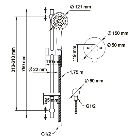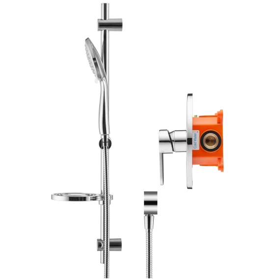 Душевой шланг, Душевая лейка, Держатель для душевой лейки, Подключение для душевого шланга, Скрытая монтажная часть, Мыльница, Штанга душевая