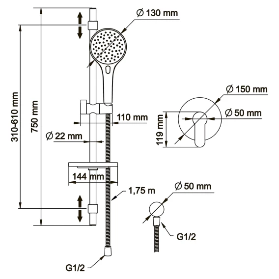 Душевой шланг, Душевая лейка, Держатель для душевой лейки, Подключение для душевого шланга, Скрытая монтажная часть, Штанга душевая