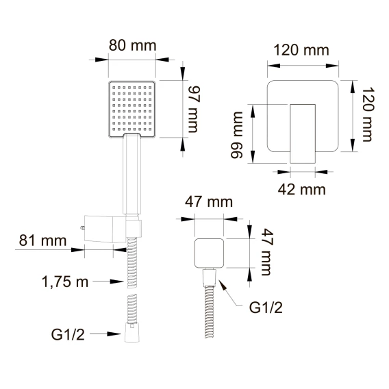 Душевой шланг, Душевая лейка, Держатель для душевой лейки, Подключение для душевого шланга, Скрытая монтажная часть