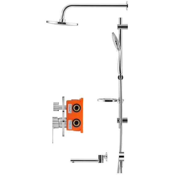 Душевой шланг, Душевая лейка, Держатель для душевой лейки, Подключение для душевого шланга, Верхний душ, Излив, Скрытая монтажная часть, Смеситель, Кронштейн, Штанга душевая