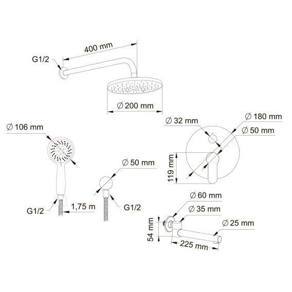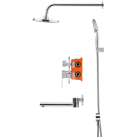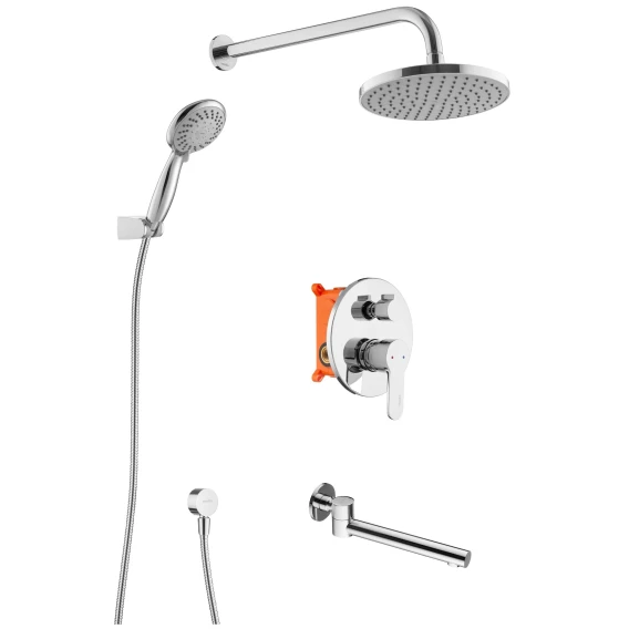 Аэратор, Душевой шланг, Душевая лейка, Держатель для душевой лейки, Подключение для душевого шланга, Верхний душ, Излив, Скрытая монтажная часть, Смеситель, Кронштейн