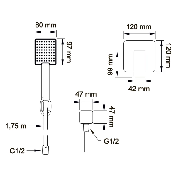 Душевой шланг, Душевая лейка, Держатель для душевой лейки, Подключение для душевого шланга, Скрытая монтажная часть