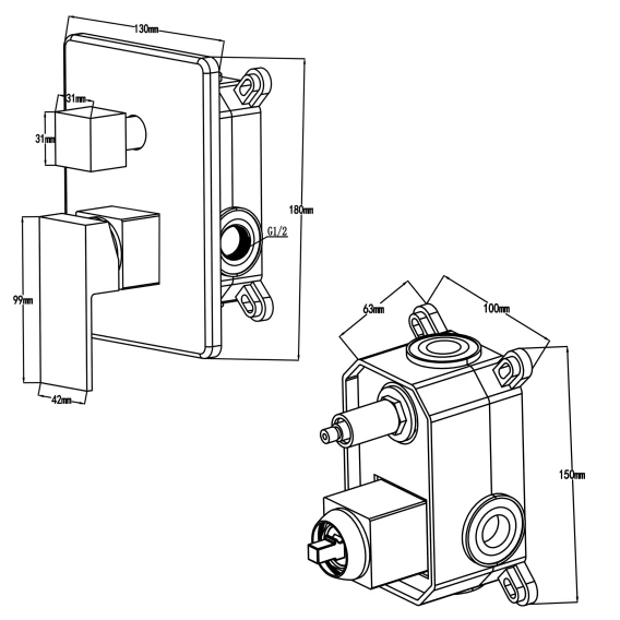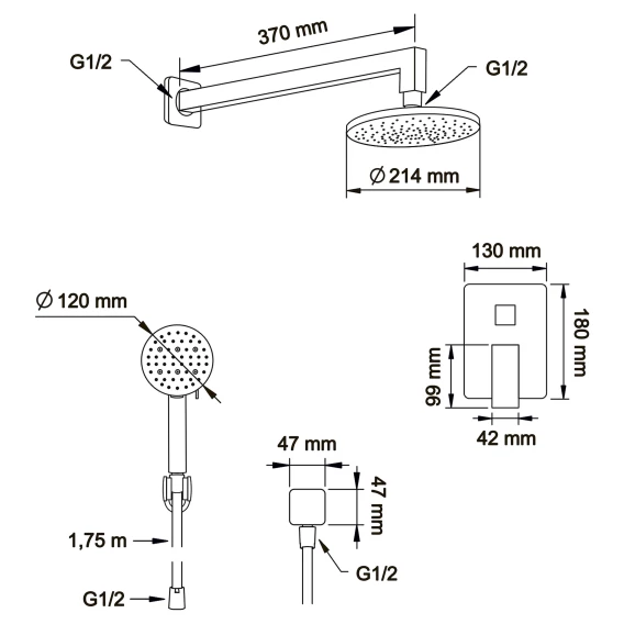 Душевой шланг, Душевая лейка, Держатель для душевой лейки, Подключение для душевого шланга, Верхний душ, Скрытая монтажная часть, Смеситель, Кронштейн