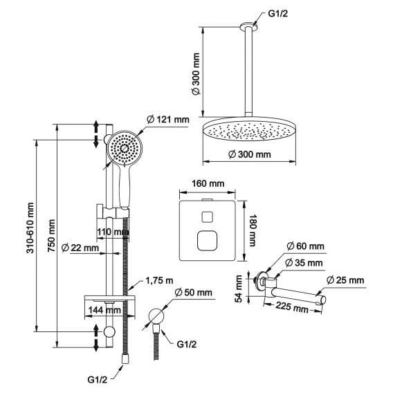 Аэратор, Душевой шланг, Душевая лейка, Держатель для душевой лейки, Подключение для душевого шланга, Верхний душ, Излив, Скрытая монтажная часть, Кронштейн, Мыльница, Штанга душевая, Термостат