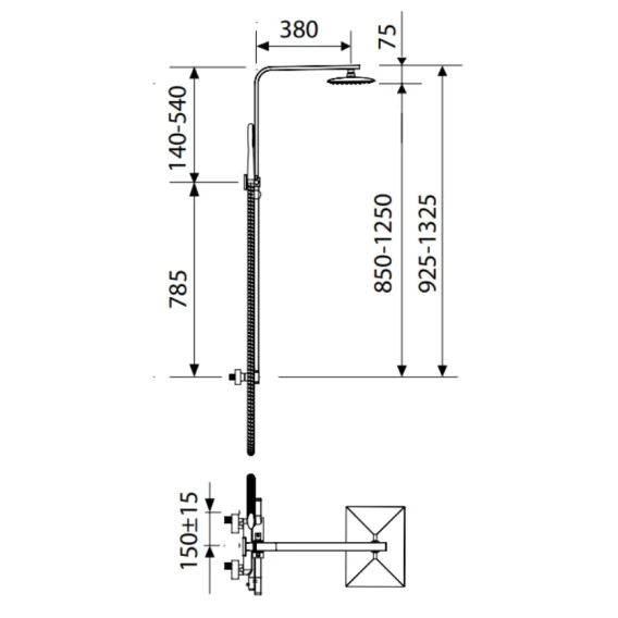 Металлическая розетка, Эксцентрики, Душевой шланг, Душевая лейка, Держатель для душевой лейки, Верхний душ, Кронштейн, Штанга душевая, Термостат