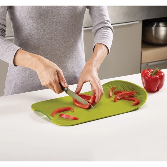 Практичная разделочная доска с дуршлагом, которая идеально подходит для измельчения овощей и фруктов. Теперь можно резать продукты и сразу их промывать. Доска также оснащена - бортиками по краям, которые удерживают кусочки еды, воду и крошки.Особенности и преимущества:- поверхность не затупляет ножи- эргономичная ручка- нескользящие планки на обратной стороне- отверстие для подвески
