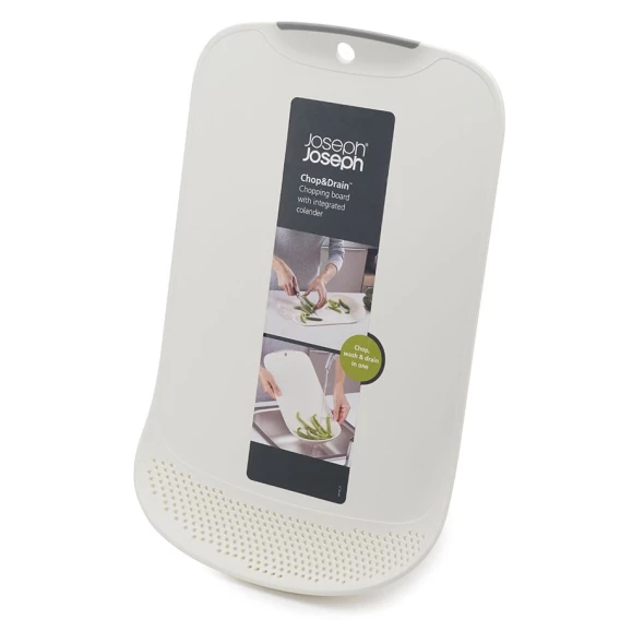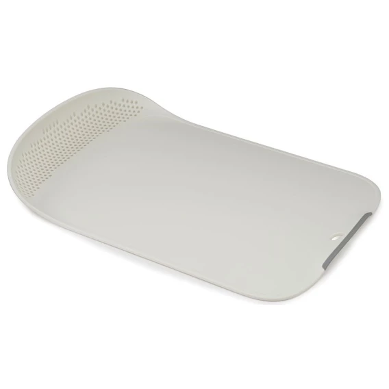 Практичная разделочная доска с дуршлагом, которая идеально подходит для измельчения овощей и фруктов. Теперь можно резать продукты и сразу их промывать. Доска также оснащена - бортиками по краям, которые удерживают кусочки еды, воду и крошки.Особенности и преимущества:- поверхность не затупляет ножи- эргономичная ручка- нескользящие планки на обратной стороне- отверстие для подвески