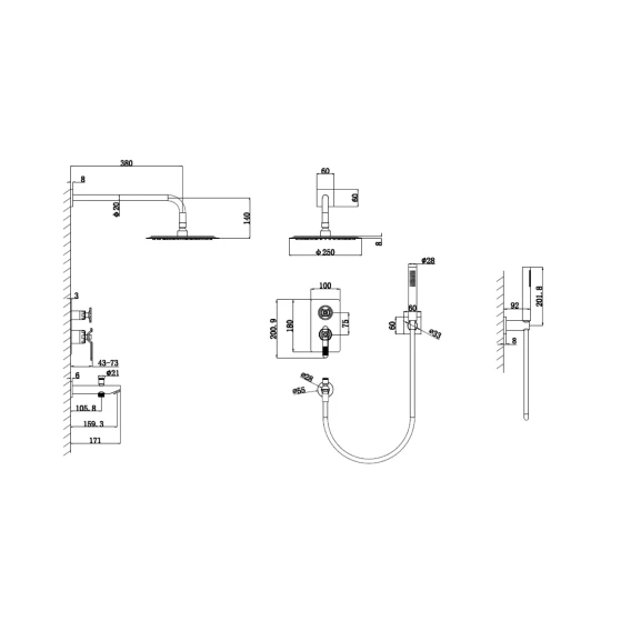 Аэратор, Душевой шланг, Душевая лейка, Держатель для душевой лейки, Подключение для душевого шланга, Верхний душ, Излив, Скрытая монтажная часть, Смеситель, Кронштейн