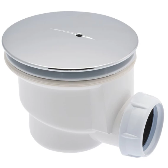 Сифон для душ.поддона, пластик, под отверстие в поддоне D90мм. Универсальный (для поддонов керамика/акрил/сталь), декор. крышка из ABS хром. Слив на 40мм.