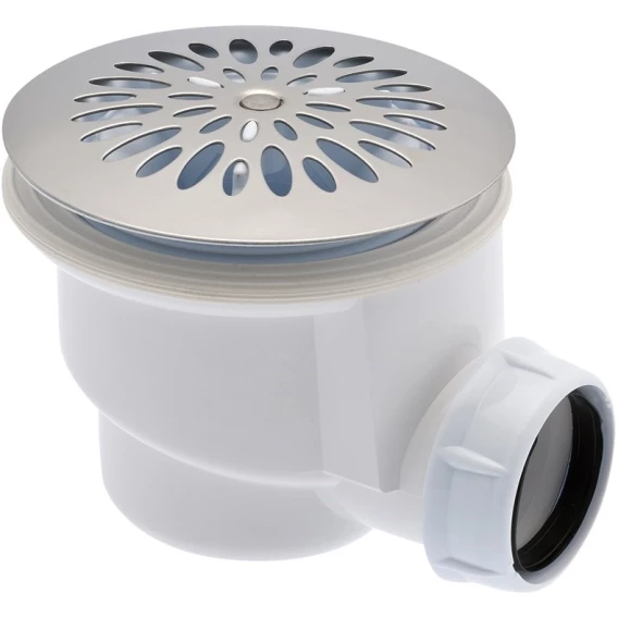 0205075 (695) Сифон для душ.поддона, пластик, под отверстие в поддоне D90мм. Универсальный (для поддонов керамика/акрил/сталь), декор. крышка из нерж. стали. Слив на 40мм. Nicoll