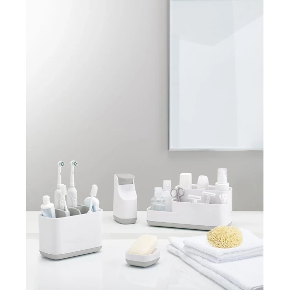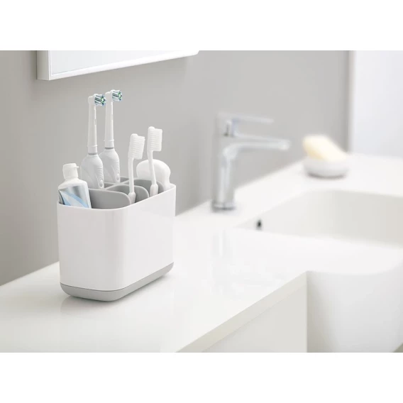 Этот универсальный органайзер для большой семьи был создан с учётом всех особенностей хранения средств для поддержания гигиены полости рта. Вместительные отсеки подойдут для тюбиков с пастой, гелей, электрических и обычных зубных щёток и многого другого! Теперь всё необходимое будет у вас под рукой! Дизайн и конструкция органайзера позволяет компактно распределить предметы и сэкономить место.Чтобы избежать скопления воды и сырости, в корпусе есть вентиляционные отверстия, которые помогают предметам быстро сохнуть. На дне есть специальные силиконовые ножки, которые придают аксессуару дополнительную устойчивость на гладких поверхностях.Органайзер легко разбирается и моется.Ванная — одна из наиболее сложных для уборки комнат. Здесь вопрос экономии места особенно актуален. Для создания новых аксессуаров дизайнеры Joseph Joseph руководствовались принципами рационального использования пространства, эргономичностью и удобством сортировки.