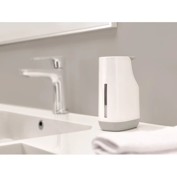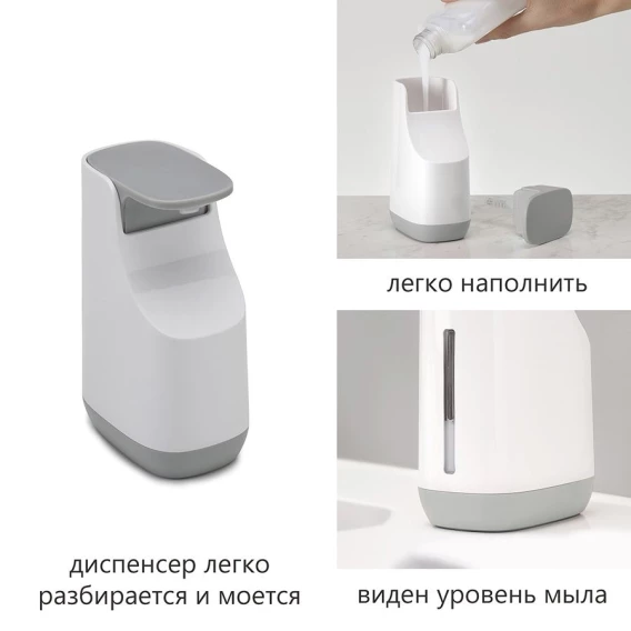 Стильный и компактный диспенсер для жидкого мыла поможет сохранить место вокруг раковины. Широкая помпа легко нажимается, дозатор рассчитан на оптимальное количество мыла на каждый раз. На корпусе диспенсера предусмотрен выступ для капель и шкала для своевременного пополнения мыла.Диспенсер оснащен специальными силиконовыми ножками, которые придают ему дополнительную устойчивость на гладких поверхностях. Он легко разбирается и моется. Общий объём: 350 мл. Диспенсер отлично подойдет для ванной в современном стиле, его можно комбинировать с другими аксессуарами из коллекции Joseph Joseph.Ванная — одна из наиболее сложных для уборки комнат. Здесь вопрос экономии места особенно актуален. Для создания новых аксессуаров дизайнеры Joseph Joseph руководствовались принципами рационального использования пространства, эргономичностью и удобством сортировки.