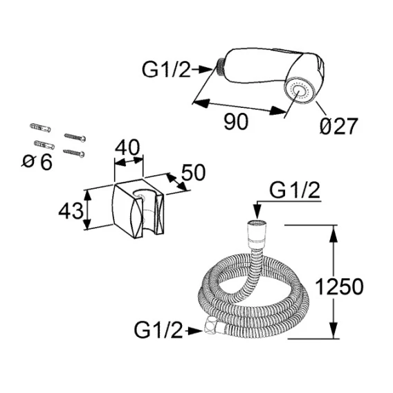 Крепление, Душевой шланг, Душевая лейка, Держатель для душевой лейки