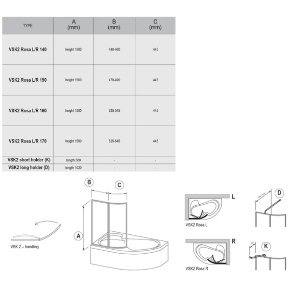 Шторка для ванны 98 см Ravak VSK2 Rosa 160 R белый rain 76P9010041