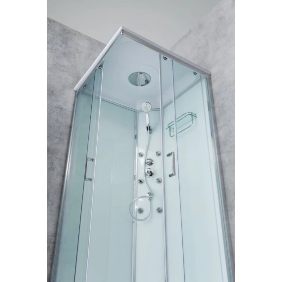 Душевой шланг, Душевая лейка, Держатель для душевой лейки, Подключение для душевого шланга, Полочка, Ручки, Верхний душ, Металлический каркас, Поддон, Смеситель, Сифон, Ножки