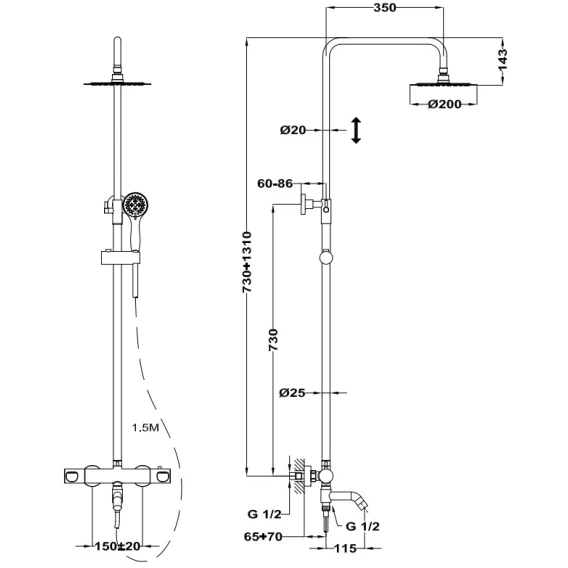 Аэратор, Металлическая розетка, Эксцентрики, Душевой шланг, Душевая лейка, Держатель для душевой лейки, Верхний душ, Излив, Кронштейн, Штанга душевая, Термостат