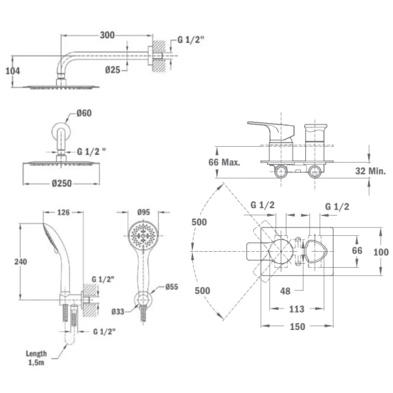 Душевой шланг, Душевая лейка, Подключение для душевого шланга с держателем, Верхний душ, Скрытая монтажная часть, Смеситель, Кронштейн