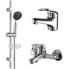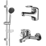 Крепление, Аэратор, Гибкая подводка, Металлическая розетка, Эксцентрики, Душевой шланг, Душевая лейка, Держатель для душевой лейки, Смеситель, Мыльница, Штанга душевая