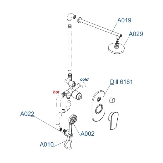 Душевой шланг, Душевая лейка, Подключение для душевого шланга с держателем, Верхний душ, Скрытая монтажная часть, Смеситель, Кронштейн