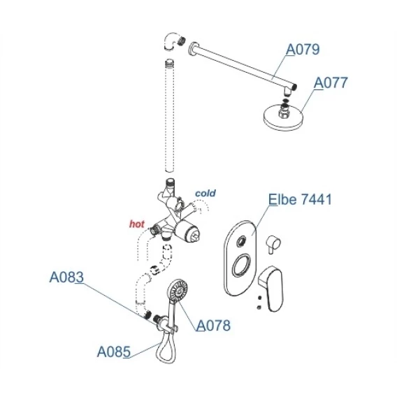 Душевой шланг, Душевая лейка, Подключение для душевого шланга с держателем, Верхний душ, Скрытая монтажная часть, Смеситель, Кронштейн