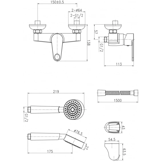 Металлическая розетка, Эксцентрики, Душевой шланг, Душевая лейка, Держатель для душевой лейки