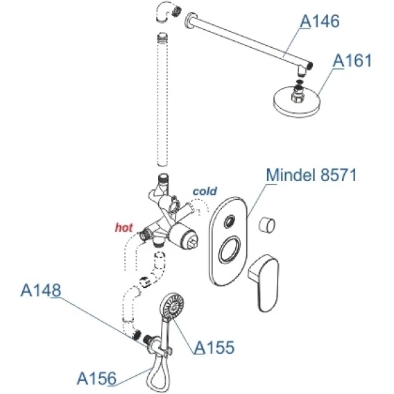 Душевой шланг, Душевая лейка, Подключение для душевого шланга с держателем, Верхний душ, Скрытая монтажная часть, Смеситель, Кронштейн