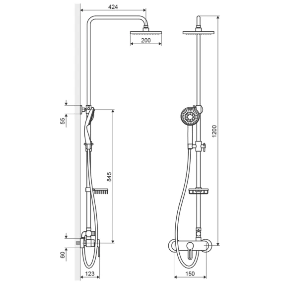 Металлическая розетка, Эксцентрики, Душевой шланг, Душевая лейка, Держатель для душевой лейки, Верхний душ, Смеситель, Кронштейн, Мыльница, Штанга душевая