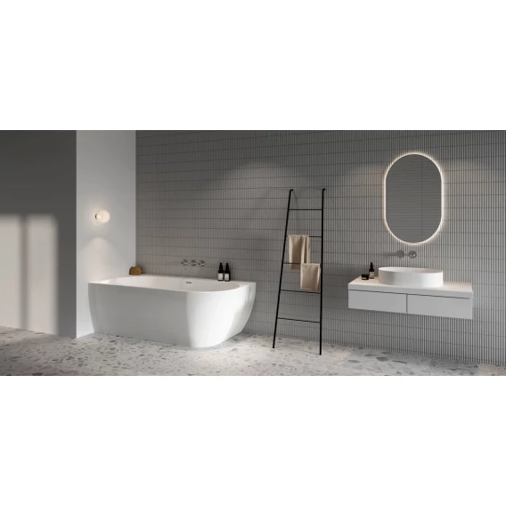 Ванну нельзя дополнить шторой для ванны. Все коммуникации должны прокладываться ниже уровня пола (сток, выводы холодной/горячей воды для напольного смесителя). В комплектацию изделия входят ножки, перелив, слив и сифон. По дизайну сочетается с отдельно стоящим напольным смесителем FM 080.00.