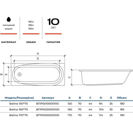 Акриловая ванна Alba Spa Baline ВПР0010000100 150x70 см, белый